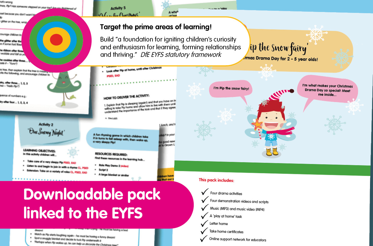 No matter what your experience of drama, you can bring Pip the snow fairy to life and create a magical world for children to explore – all day long! Sing, dance, pretend, and play and send children home with an (imaginary!) snow fairy of their own to take care of during the Christmas holidays.